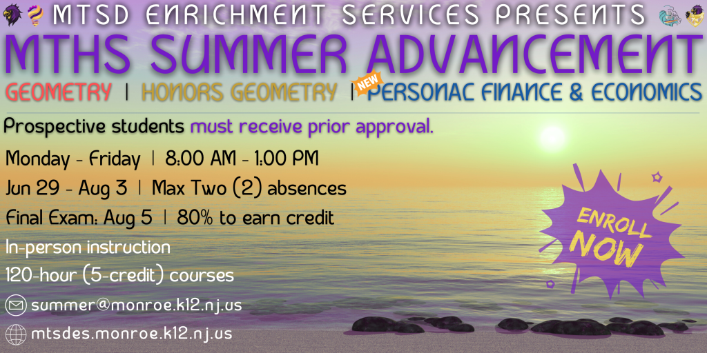 The Monroe Township High School is proud to announce the continuation and expansion of the MTHS Summer Advancement program. This summer, the MTHS and MTSD Enrichment Services (MTSDES) once again offer Geometry and Honors Geometry program advancement courses. Additionally, we are excited to introduce the all-new MTHS Personal Finance & Economics credit acquisition course. Students who complete our summer advancement courses (> 80) and earn a grade of > 80% on the corresponding final exam will complete their respective programs.